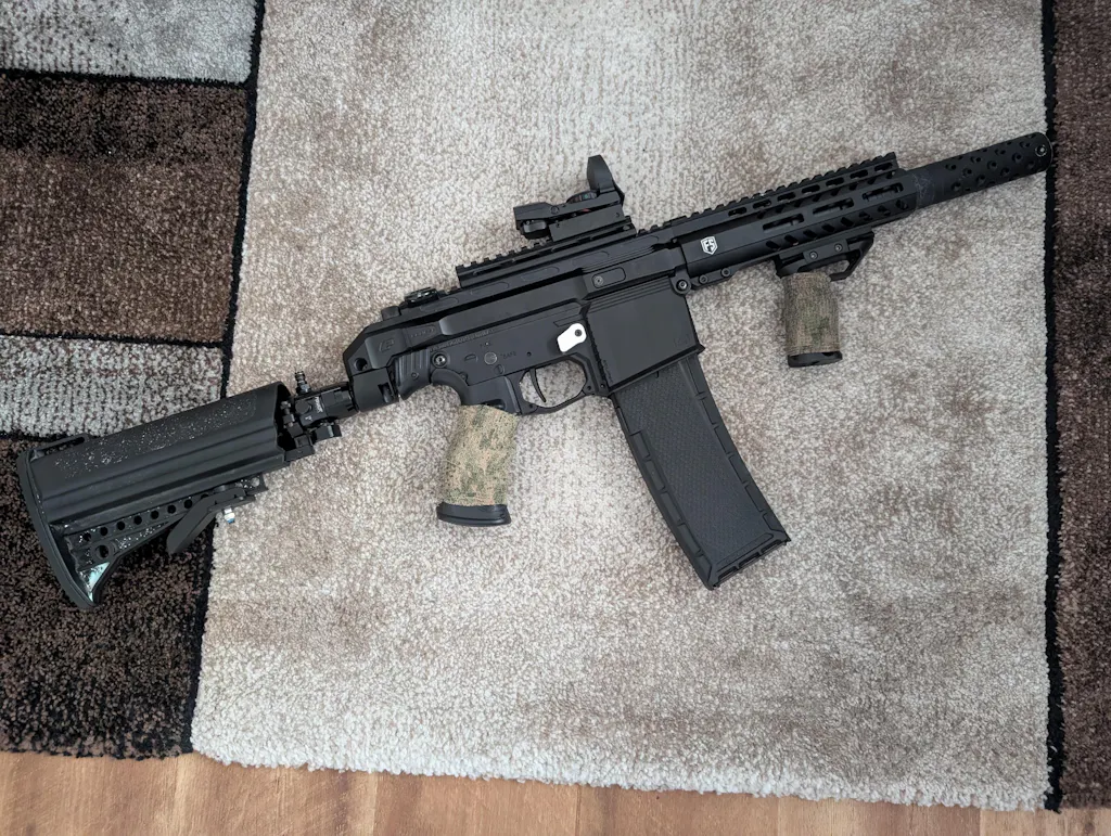 Optional kannst du das Setup später noch weiter in Richtung Anschlag/Ergonomie bringen – z. B. mit einem EMC Adjustable Stock (separat erhältlich), wenn du dein Trage- und Schultergefühl noch stärker anpassen willst.