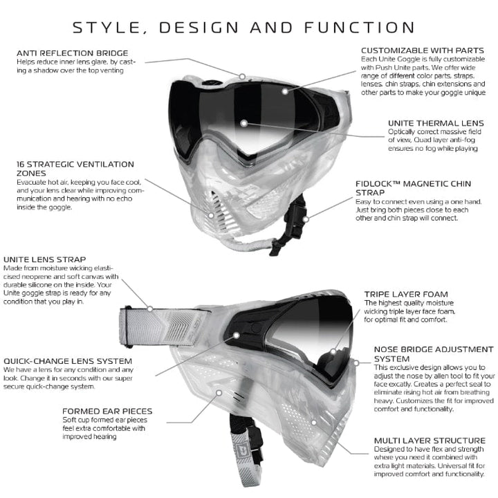 Die Push Unite Maske vereint jahrzehntelanges Wissen der einflussreichsten Spieler des Spiels. Das Ergebnis ist eine neue Maske, die sich in Passform, Funktion und Stil nicht verstecken muss. Die Unite Maske verfügt über eine komplette Gesichtsanpassung mit einstellbarer Nasenbrücke, weichen Ohrmuscheln und zweifachem Spritzguss. Eine beispiellose 16 Ventilationszonen maximiert den Luftstrom, um Sie kühl und komfortabel zu halten und die Kommunikation zu verbessern. Die optisch korrekte sphärische Linse ist größer, stärker und leichter als je zuvor. Noch dazu bietet sie ein Schnellwechselsystem, das sowohl einfach als auch effektiv ist. Maximieren Sie Ihre Sicht und maximieren Sie Ihre Erfahrung mit dieser hochmodernen Maske von Push.