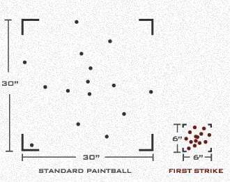 First Strike Paintballs zeichnen sich durch ihr aerodynamisches Design aus - die Bälle, bzw. besser die Geschosse, sind nicht kugelrund sondern ähneln in ihrer Form einer echten Gewehrkugel.