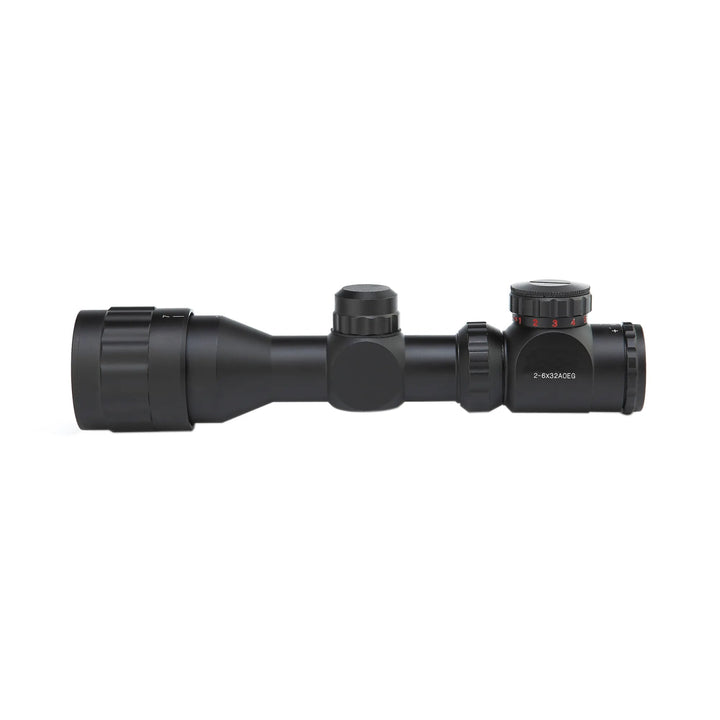 Das Zielfernrohr bietet eine Vergrößerung von 2-6x. Der Durchmesser des Tubus beträgt 25,4mm (1,0 Zoll), was eine robuste und langlebige Konstruktion gewährleistet. Das Gehäuse aus Aluminium in elegantem Schwarz unterstreicht nicht nur die hochwertige Optik, sondern bietet auch Schutz vor den Elementen und den Strapazen des Geländes.