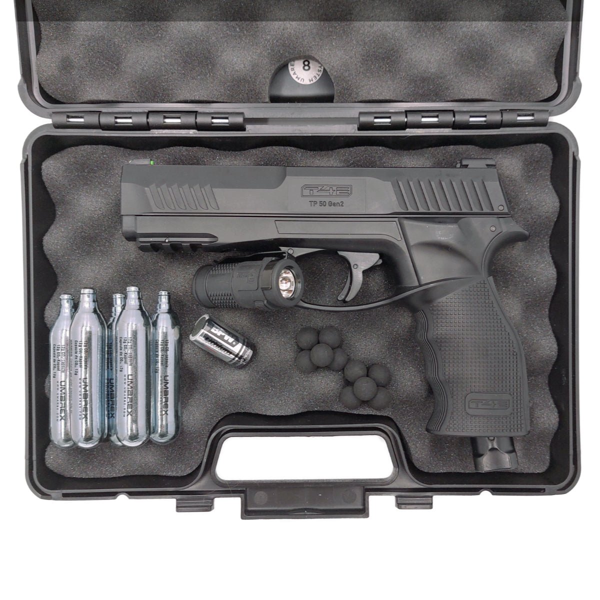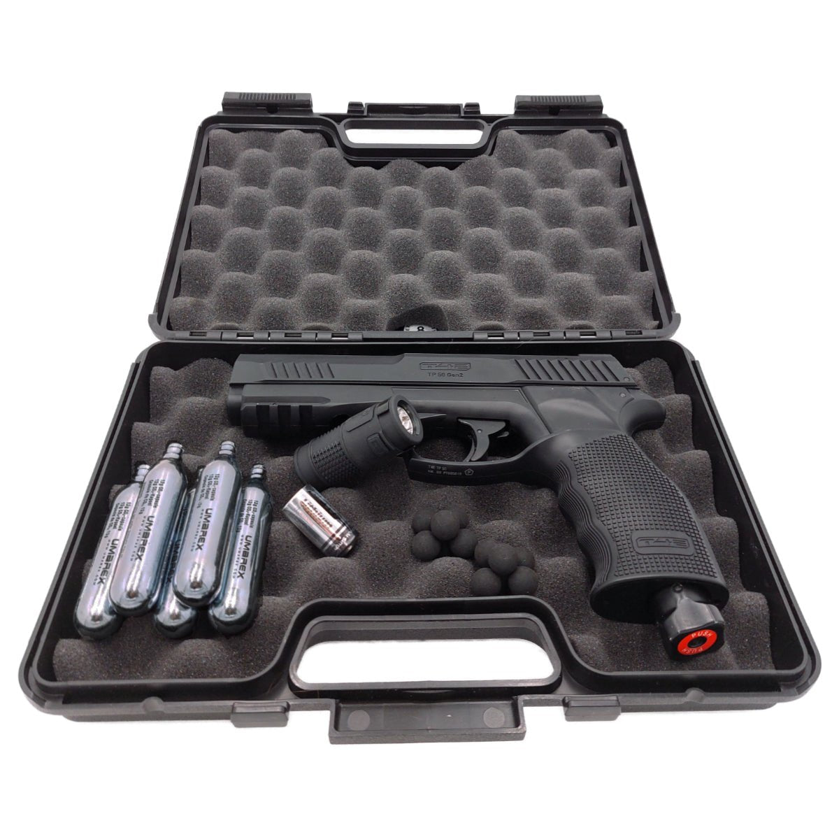 Das Set enthält 5 CO₂-Kartuschen (12g). Diese werden in das Griffstück eingesetzt und liefern den Druck, um die Rubberballs (Gummikugeln) mit hoher Geschwindigkeit zu verschießen.