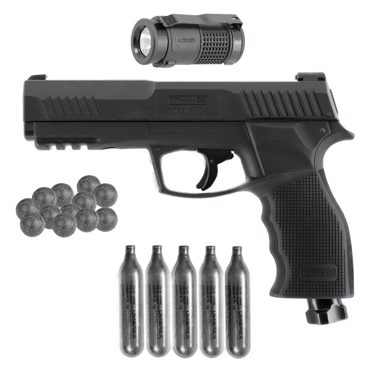 Das Set enthält 5 CO₂-Kartuschen (12g). Diese werden in das Griffstück eingesetzt und liefern den Druck, um die Rubberballs (Gummikugeln) mit hoher Geschwindigkeit zu verschießen.